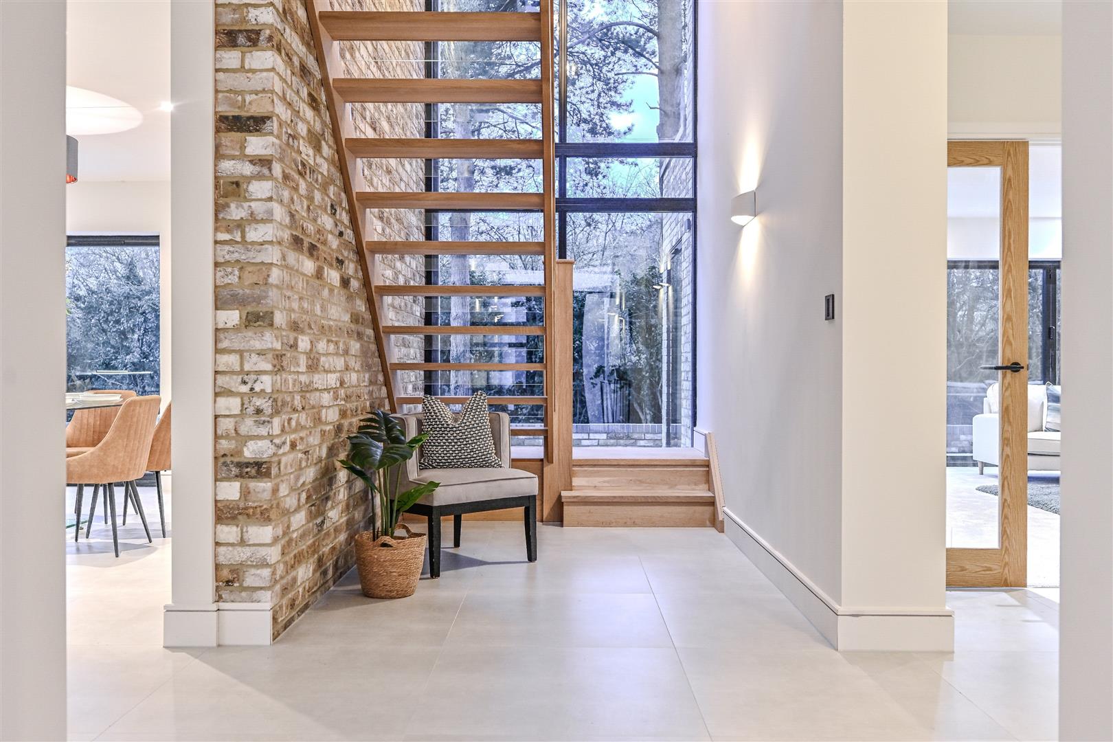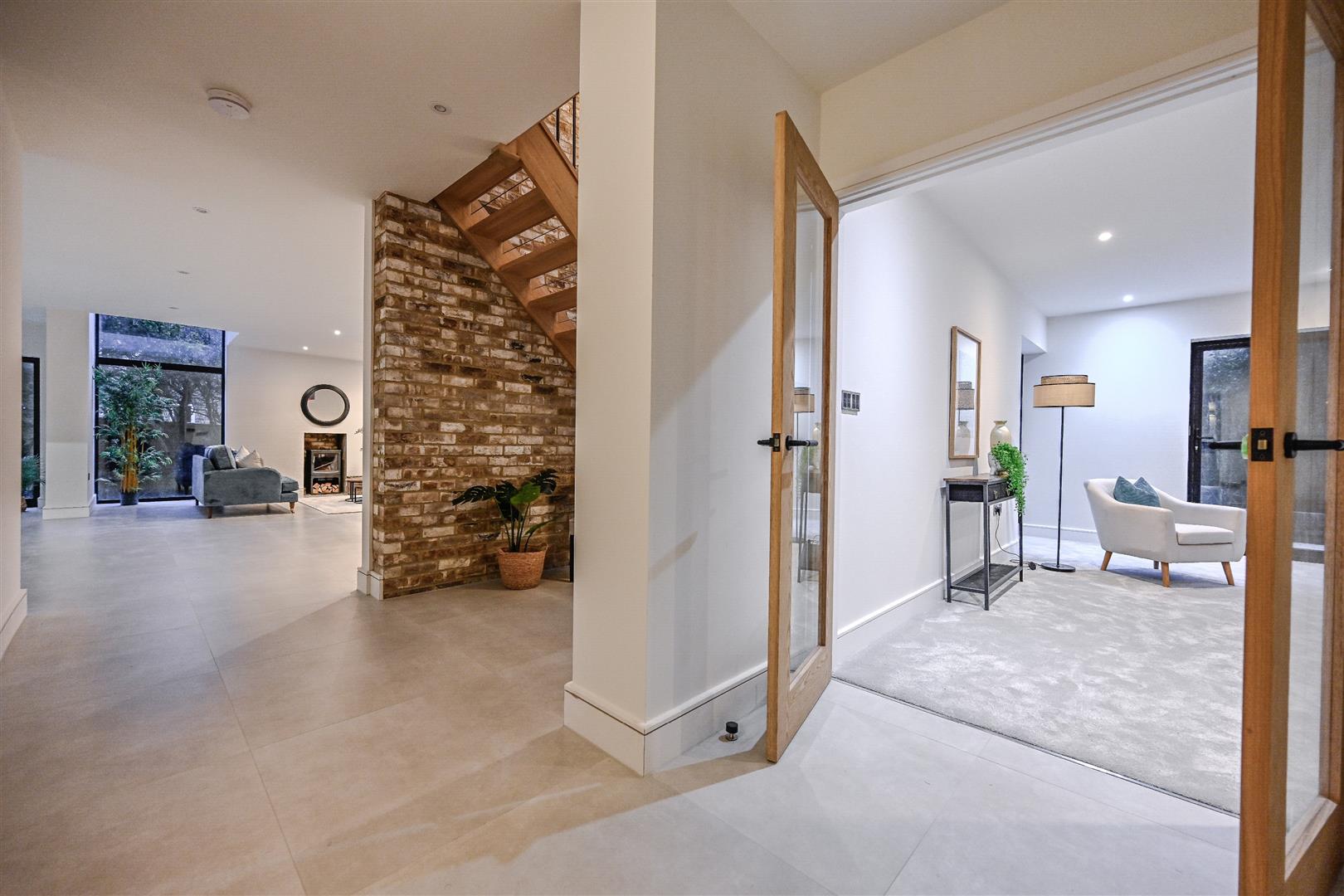 The glazed entrance to the property has a real wow factor as your eye is drawn skywards to the towering ceilings and galleried landing, with concealed storage and a sneak peek at the gardens at the rear.
