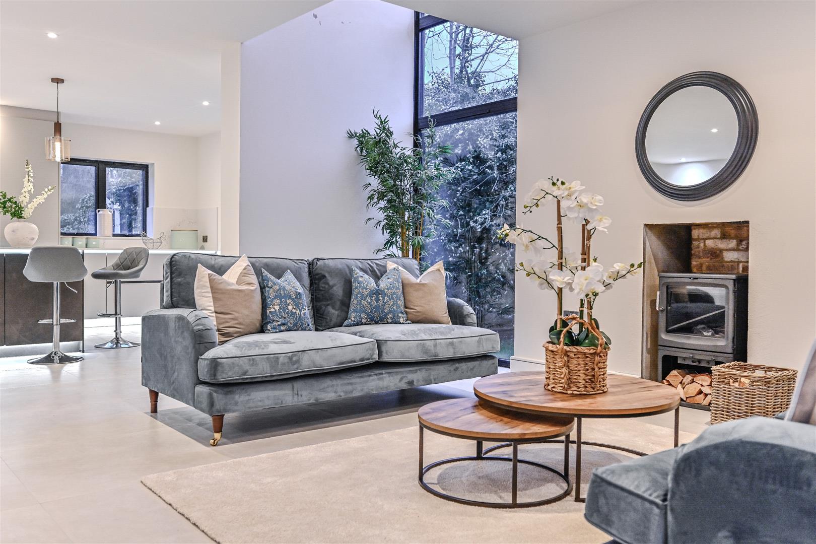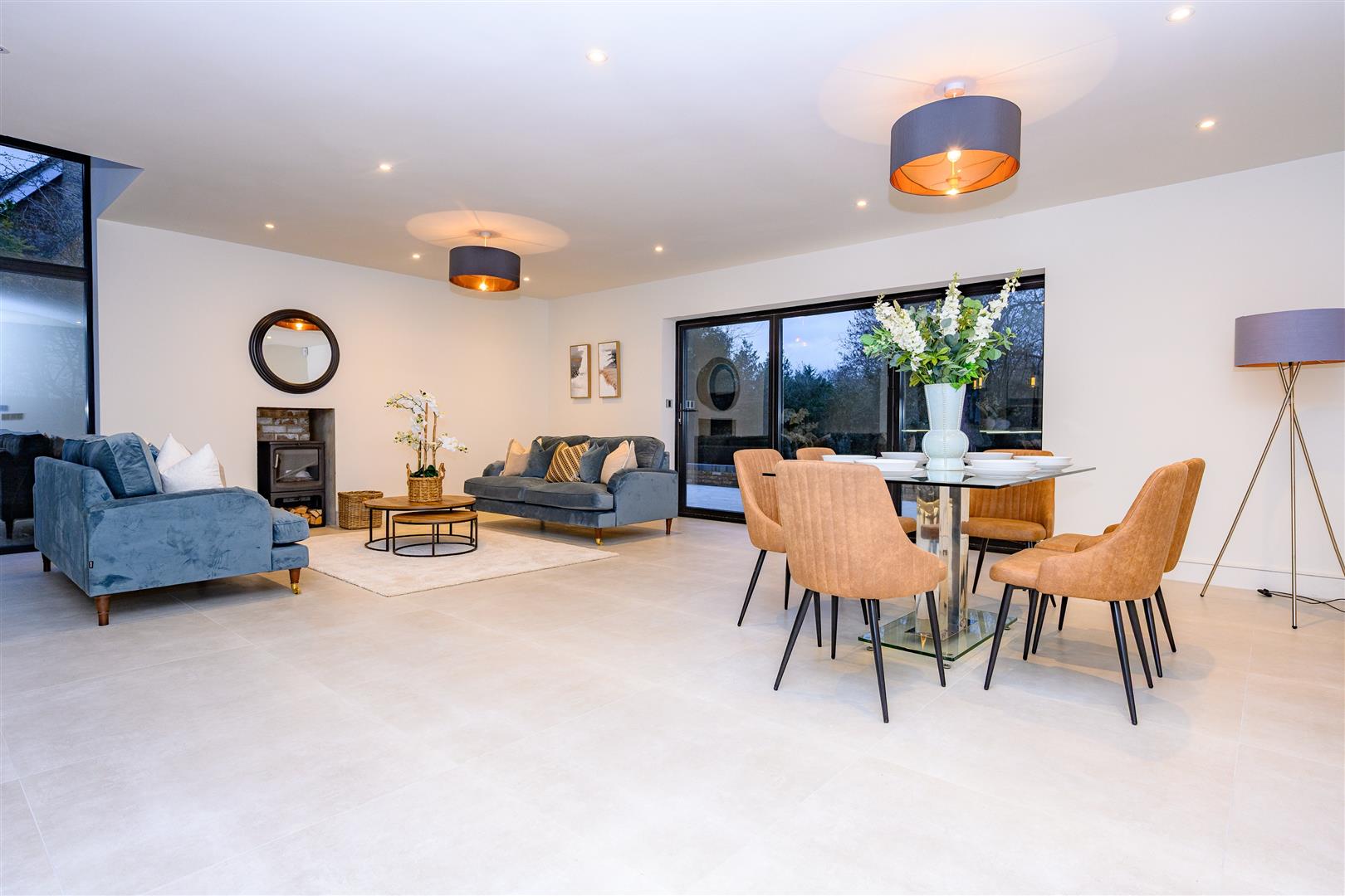 The left side of the ground floor is a fantastic open-plan space. The dining and living space has a log burner and glazed sliding doors, perfect for throwing open in the warmer months and allowing the sweet-scented summer breeze to flow through the home.