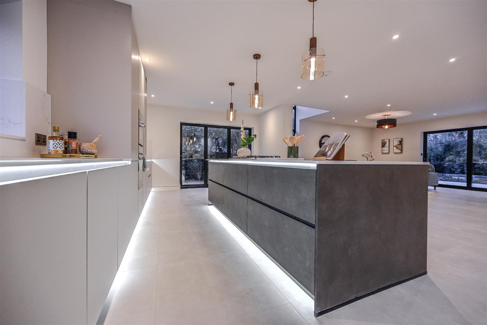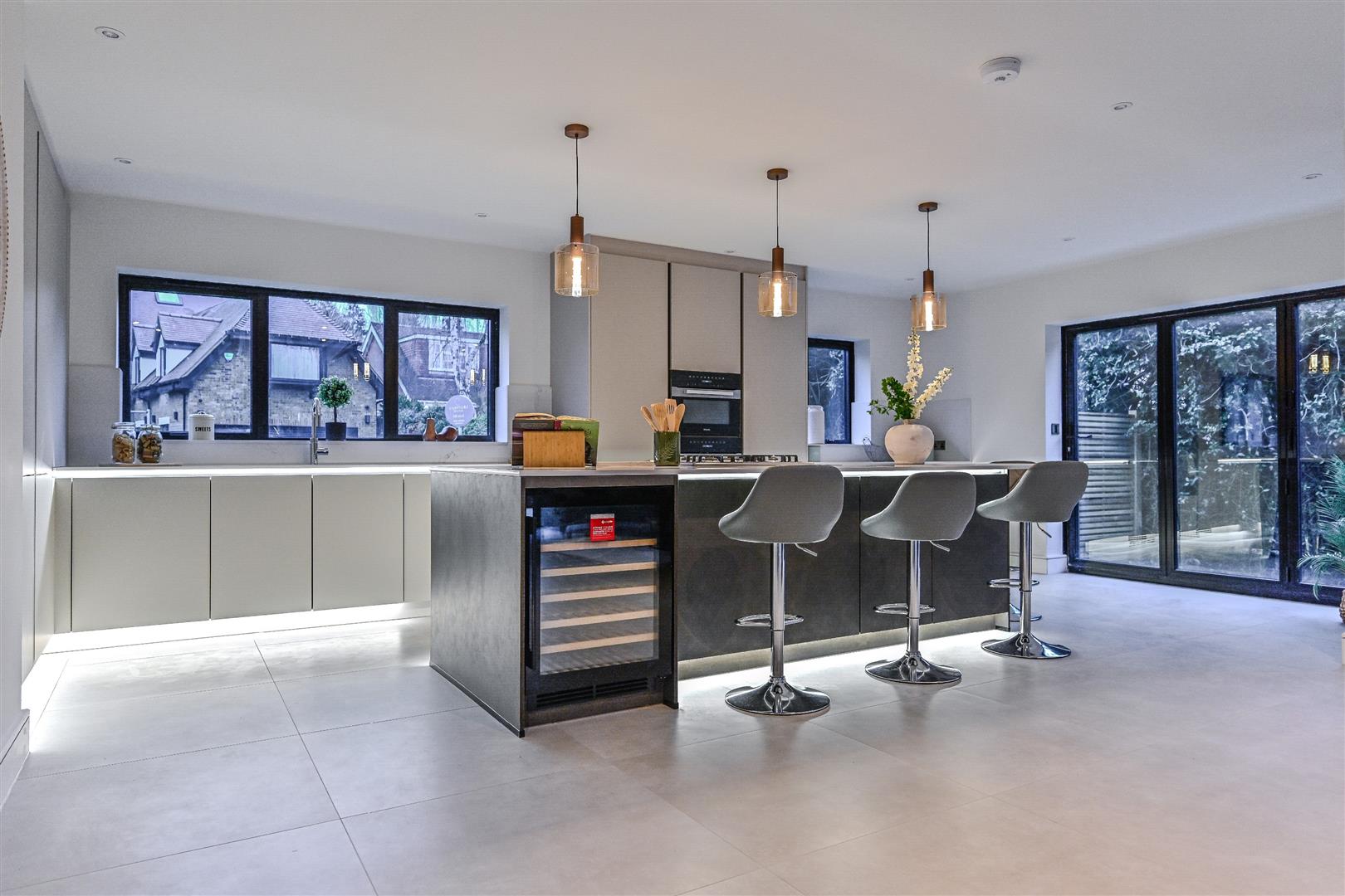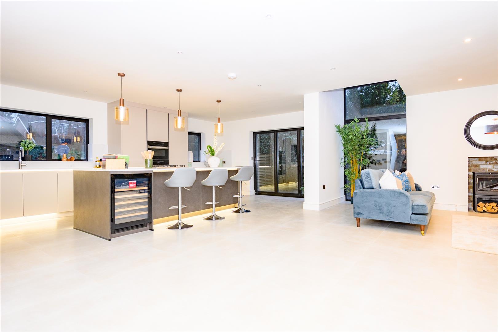 The living room is not just spacious, but also designed for comfort, with sliding glazed doors opening the room to the gardens, creating a seamless connection to the outside space. This room offers a comfortable area to relax, ensuring that you can unwind after a long day.